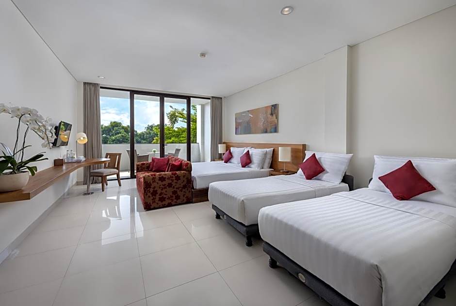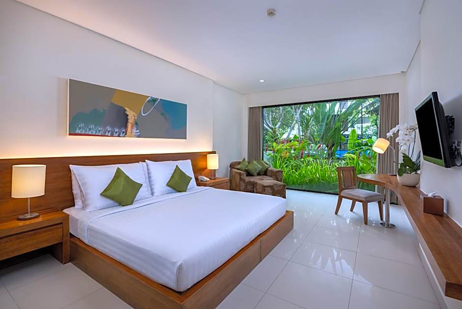 Outside, a terrace and garden views provide spaces to unwind after sun and sea. Beach life starts at the doorstep with free beach umbrellas and free beach chairs for relaxed afternoons by the water. An adults-only pool with a plunge adds a touch of grown-up luxury, while Atma Restaurant brings together American, Indonesian, Asian, and International flavors in a setting that can feel family-friendly, modern, or romantic.